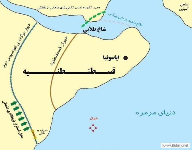 همانطور که گفته شد، سه جهت قسطنطنیه را آب فرا گرفته بود، از سمت جنوب و غرب به دریای مرمره و از شرق و شمال شرقی به تنگه‫‌ی بوسفور و از شمال به شاخ طلایی (خلیج) که بسیار شدید با لشکری بزرگ از آن محافظت می‫‌شد و از ورود هر کشتی به درون آن جلوگیری می‫‌شد.